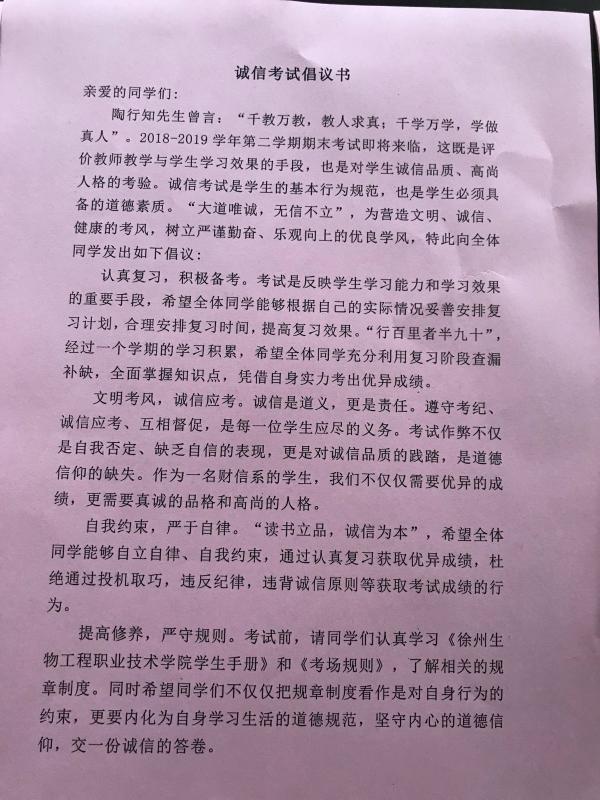 诚信是中华民族的传统美德,是每个人的立身之本。树道德之新风,立诚信之根基,是我们当代大学生青年义不容辞的责任。 为营造良好学风校风,培养自立自律、刻苦学习的作风,财经信息系印发诚信考试倡议书号召全系同学在期末考试中自觉遵守考场纪律,杜绝各种考试舞弊行为,净化考场环境,展现自我的真实水平,用真实的成绩证明自己的实力。全系学生积极响应,并在倡议书上郑重的签下自己的名字。 (供稿:财经信息系) |