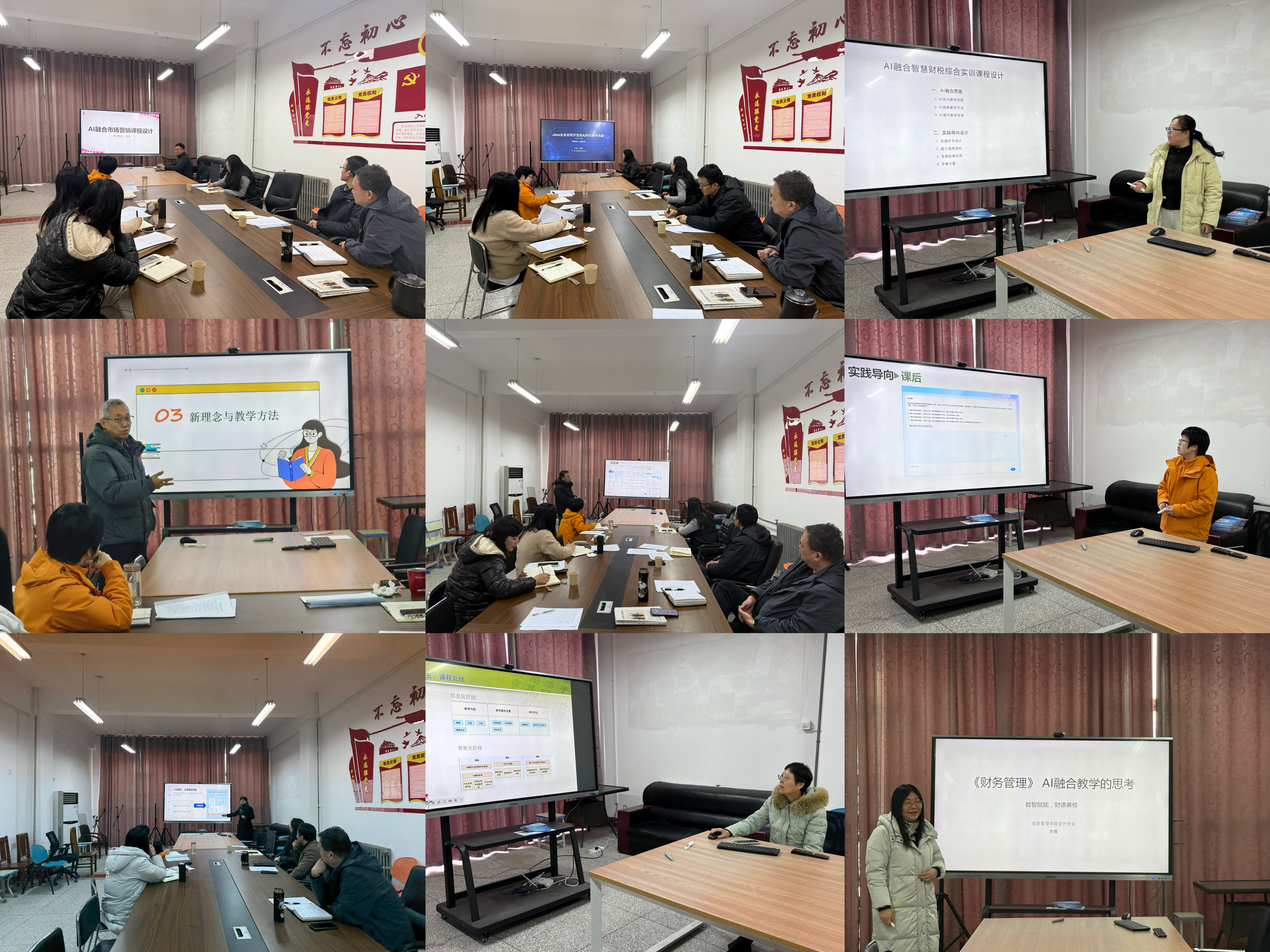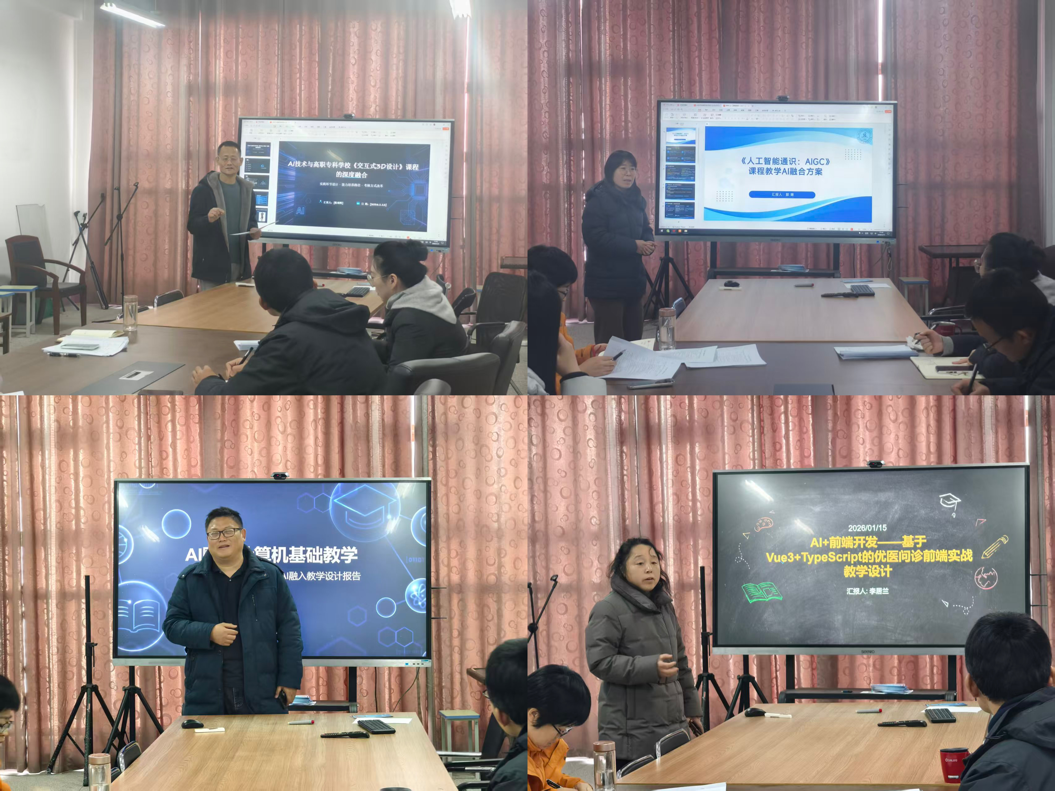 汇报环节,各专业教师结合教学实践,精准分享AI融合设计成果。大数据与会计专业聚焦财务数据智能分析、税务风险预警等核心场景,提出引入AI财务软件实操模块,助力学生提升数据处理效率与风险研判能力;电子商务专业锚定AI精准营销、智能客服领域,分享算法推荐、用户画像分析的教学案例,彰显技术对电商教学的赋能价值;计算机及物联网专业围绕AI算法、智能硬件开发课程,阐述仿真教学平台搭建思路,提出以AI优化实践教学梯度,助力学生攻克技术难点、提升创新能力。